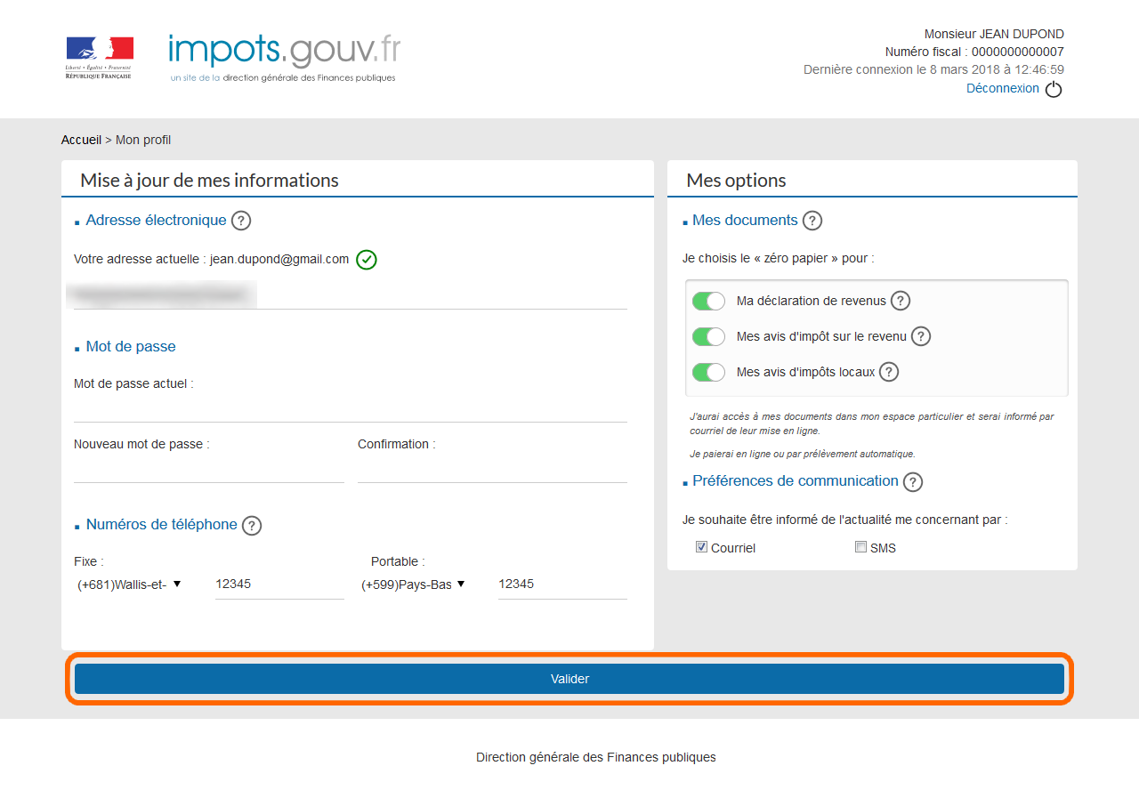 Après avoir saisi sa nouvelle adresse électronique et s'il ne souhaite pas effectuer d'autres modifications, il valide la mise à jour de ses informations.