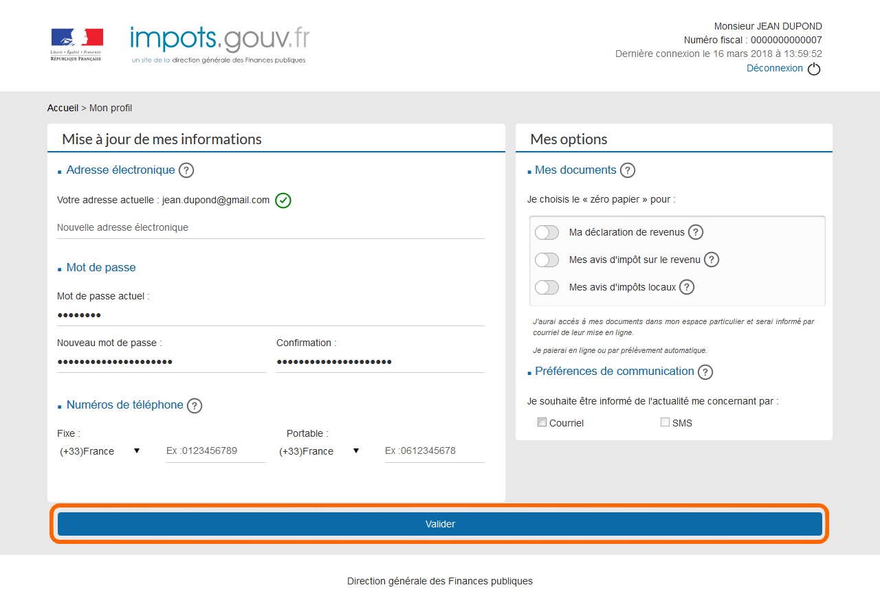Après avoir saisi son nouveau mot de passe et s'il ne souhaite pas effectuer d'autres modifications, il valide la mise à jour de ses informations.