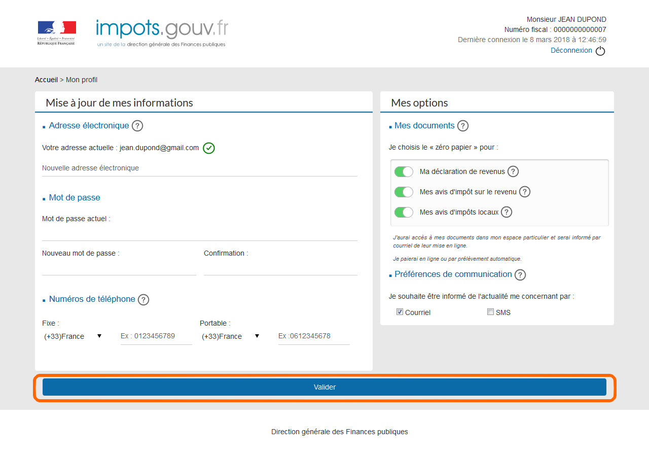 Après avoir renseigné, modifié ou supprimé ses numéros de téléphone fixe et/ou portable et s'il ne souhaite pas effectuer d'autres modifications, l'usager valide la mise à jour de ses informations.