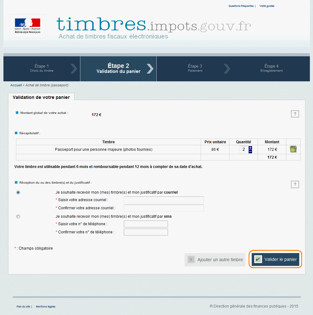 Au delà de 5 timbres, seul le canal courriel est disponible. Pour visualiser l'écran en cas d'achat de plus de 5 timbres,